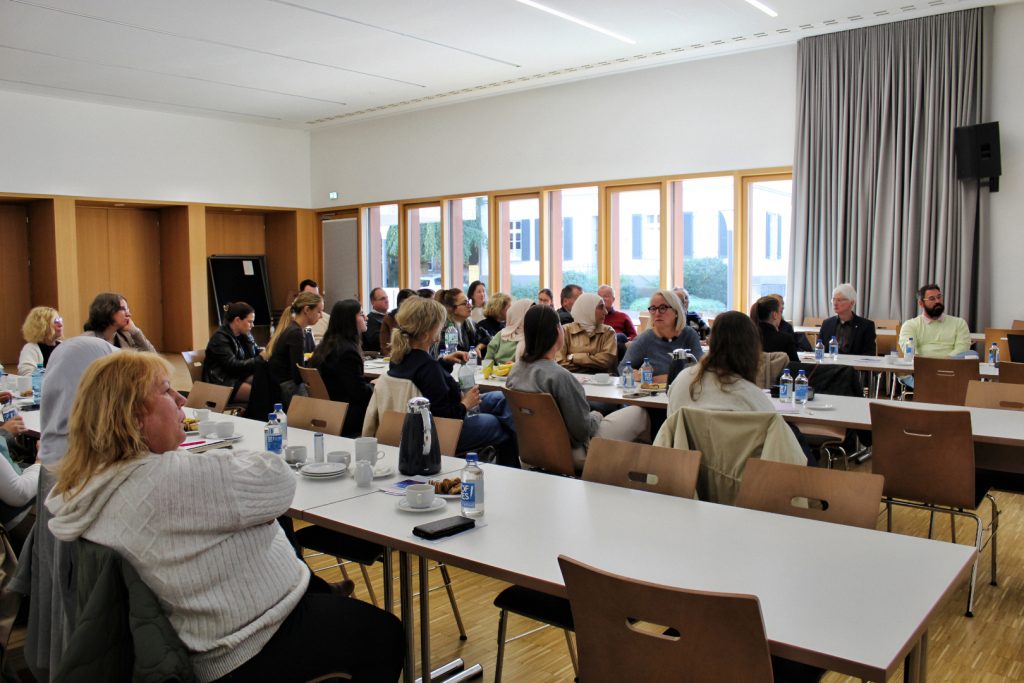 Ein ganz anderer Aspekt der Migrationsarbeit rückte im zweiten Teil der Tagung in den Fokus: die Bilingualität. Frau Prof. Dr. Leyendecker stellte die wissenschaftlichen Erkenntnisse zur frühen Zweisprachigkeit und deren Einfluss auf die kognitive Entwicklung von Kindern in den Mittelpunkt ihres Beitrags. Besonders wertvoll sei für sie, so die Referentin, der anschließende Austausch mit den Fachkräften vor Ort gewesen. In der Diskussion spiegelten sich konkrete Erfahrungen aus der Integrationsarbeit im Westmünsterland wider, die die Vielschichtigkeit des Themas unterstrichen. Dabei wurden auch Herausforderungen thematisiert, die sich im alltäglichen Umgang mit Zweisprachigkeit ergeben, insbesondere in Familien mit Fluchterfahrungen und Migrationshintergrund, etwa im Zusammenhang mit Traumatisierungen.
