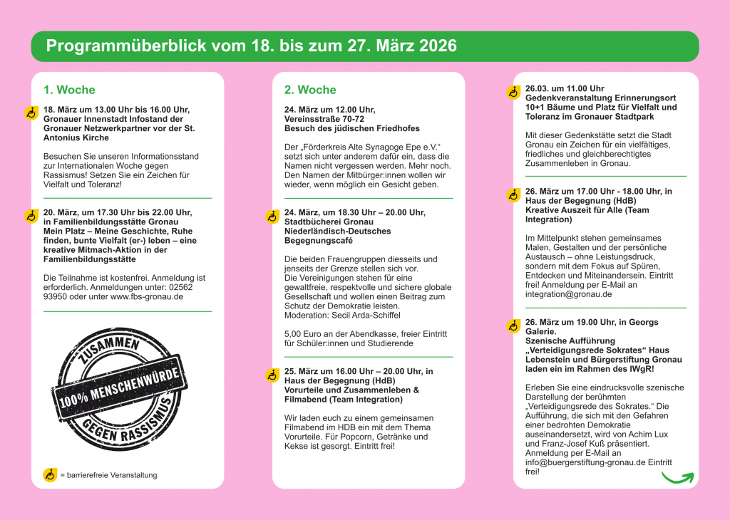 In der kommenden Woche erwartet alle Interessierten ein vielfältiges Programm mit Veranstaltungen, Aktionen und Mitmach-Angeboten rund um das Thema Rassismus und gesellschaftlichen Zusammenhalt. Ziel ist es, ein klare Zeichen gegen Ausgrenzung zu setzen und für eine offene, respektvolle Gesellschaft einzutreten.